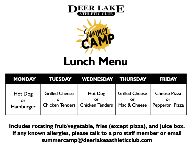 Food is made in our Poolside Restaurant fresh each day! If your camper does not like the options for a certain day, please pack your camper a lunch!